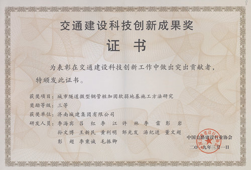 集團(tuán)《城市隧道微型鋼管樁加固軟弱地基施工方法研究》榮獲“交通建設(shè)科技創(chuàng)新成果獎(jiǎng)三等獎(jiǎng)”
