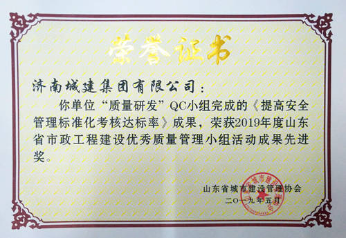 集團(tuán)“質(zhì)量研發(fā)”QC小組完成的《提高安全管理標(biāo)準(zhǔn)化考核達(dá)標(biāo)率》成果榮獲“2019年度山東省市政工程建設(shè)優(yōu)秀質(zhì)量管理小組活動成果先進(jìn)獎