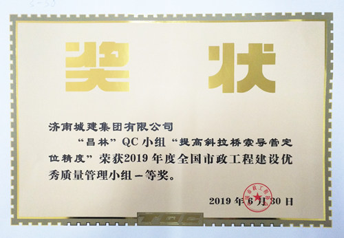集團“昌林”QC小組《提高斜拉橋索導管定位精度》榮獲“2019年度全國市政工程建設優(yōu)秀質(zhì)量管理小組一等獎”