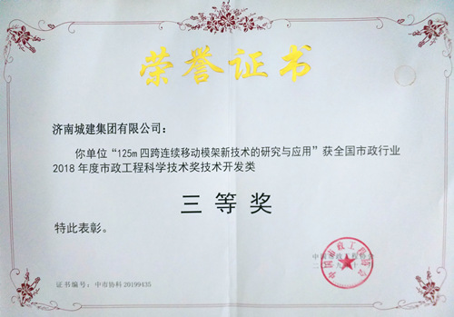 集團(tuán)《125m四跨連續(xù)移動(dòng)模架新技術(shù)的研究與應(yīng)用》榮獲“2018年度市政工程科學(xué)技術(shù)獎(jiǎng)技術(shù)開發(fā)類三等獎(jiǎng)”